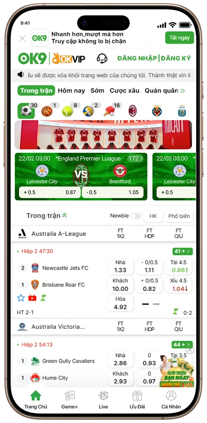 Ứng dụng có giao diện thân thiện, tốc độ ổn định và đầy đủ chức năng như trên web: bao gồm đặt cược, xem tỷ lệ kèo trực tuyến, theo dõi kết quả và rút tiền. Đây là lựa chọn tối ưu cho những ai muốn trải nghiệm OK9 Thể Thao tiện lợi và nhanh chóng hơn.